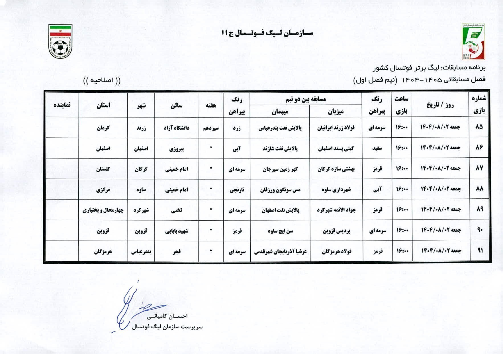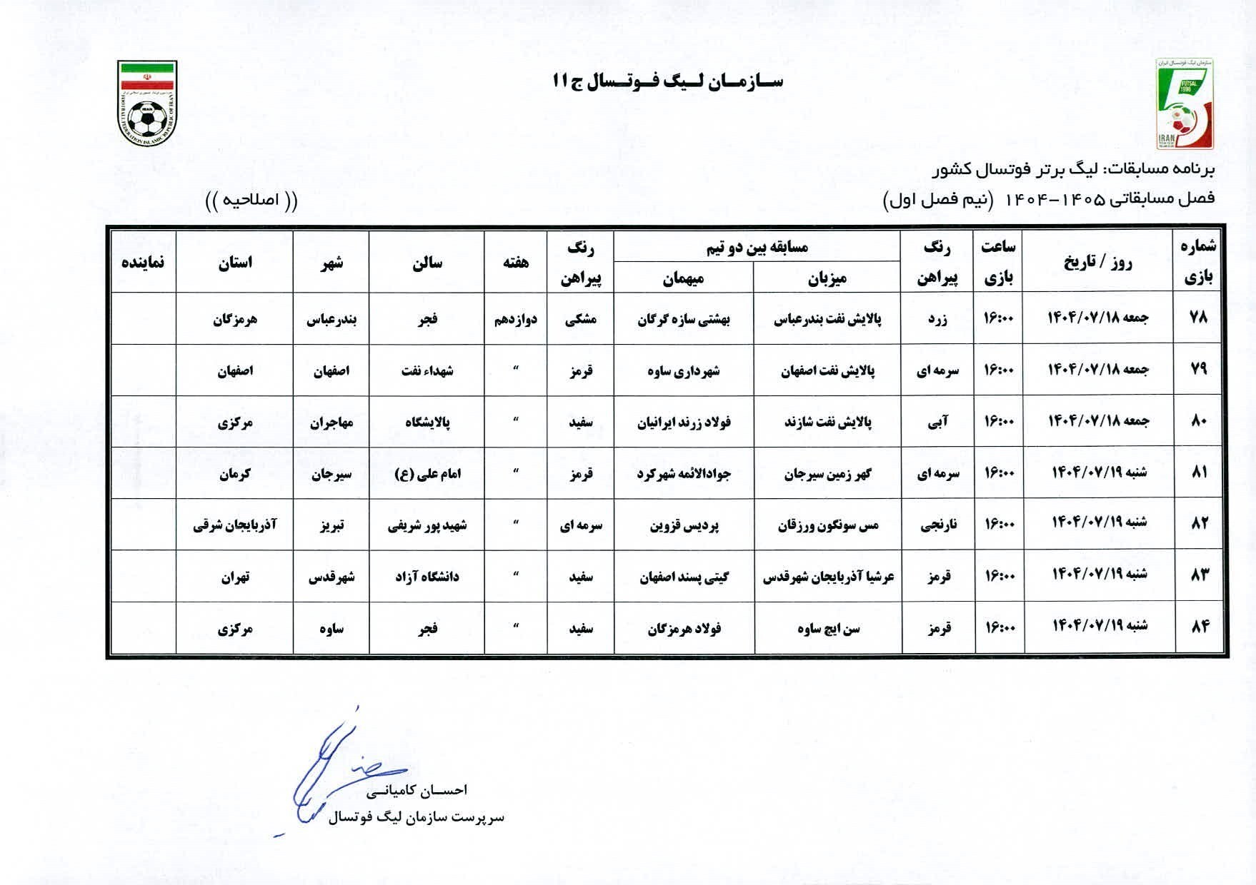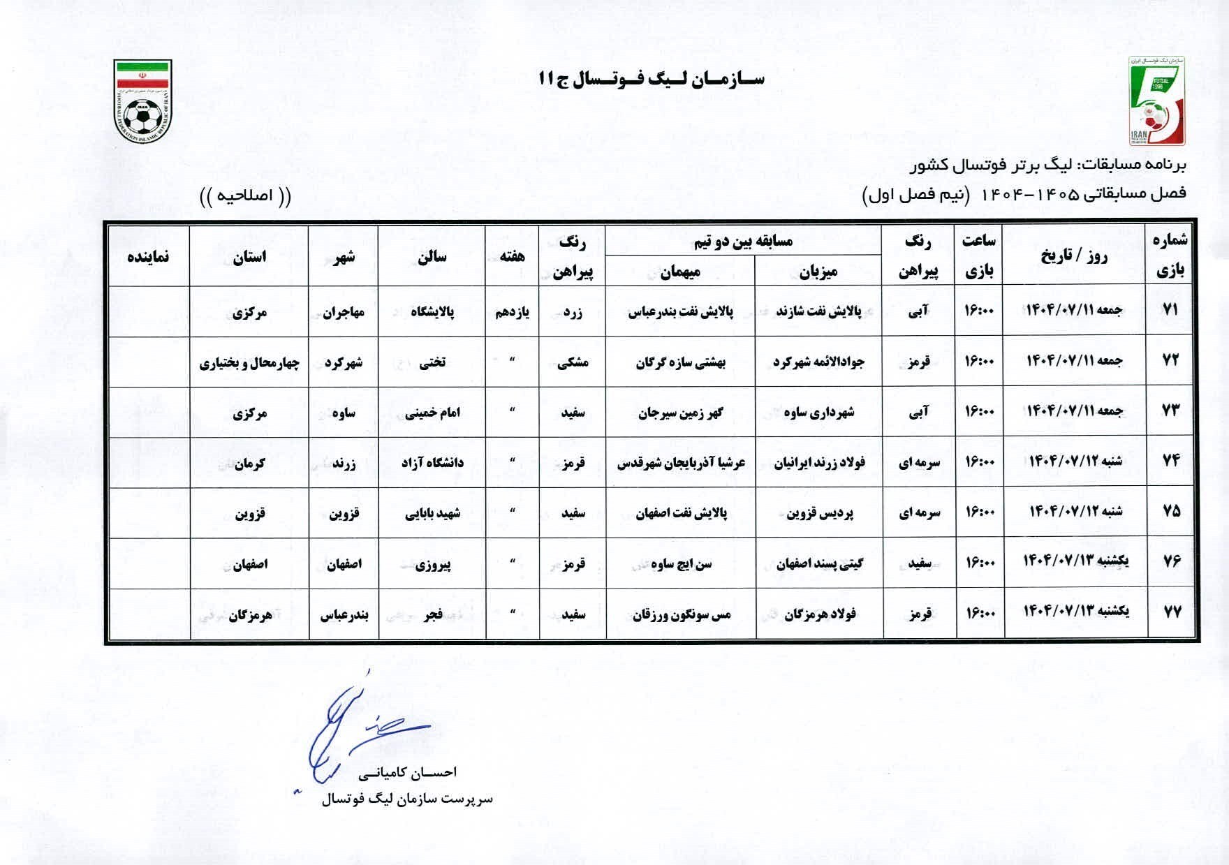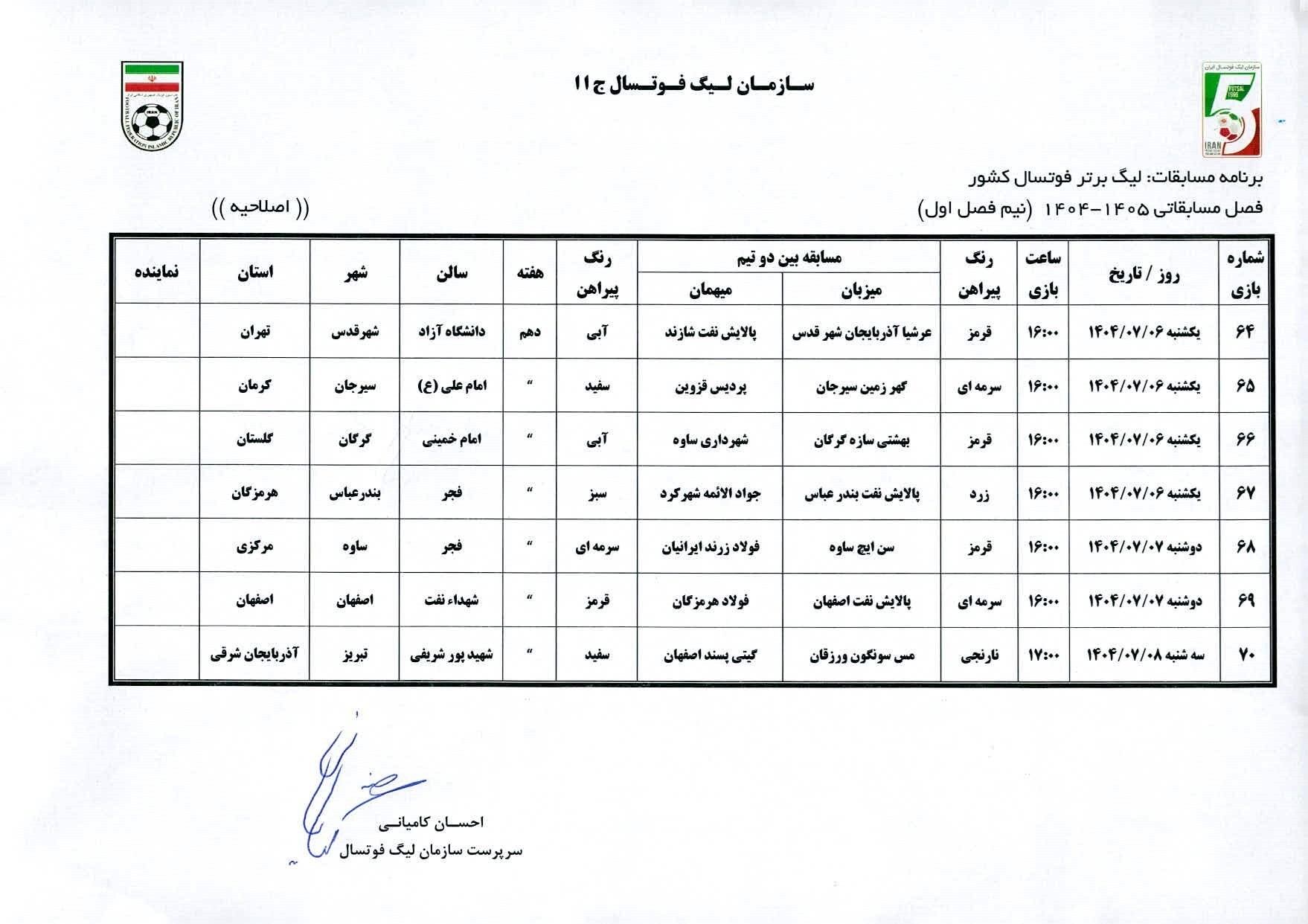 به گزارش سایت رسمی فدراسیون فوتبال، اصلاحیه برنامه مسابقات هفته اول تا سیزدهم نیم فصل اول لیگ برتر فوتسال به شرح زیر است: