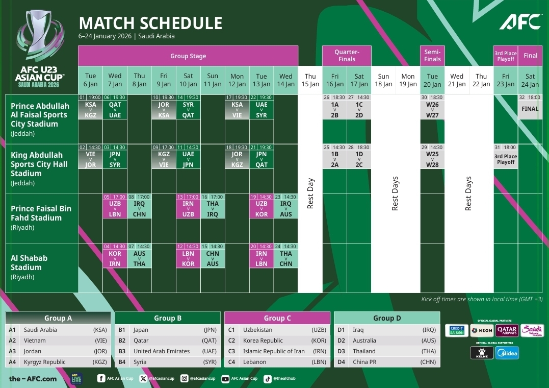 به گزارش سایت رسمی فدراسیون فوتبال، زمان برگزاری بازی های تیم ملی امید ایران در جام ملت های زیر ۲۳ سال آسیا به میزبانی ریاض عربستان مشخص شد که به شرح زیر است:
